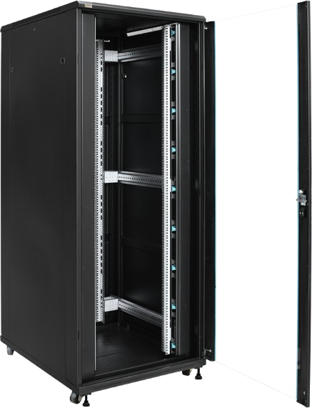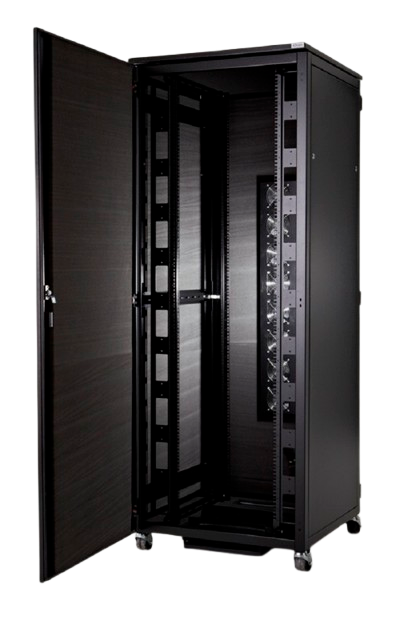 The 42U network rack is a heavy-duty, ventilated steel cabinet designed to house, organize, and secure standard-depth 19-inch rack equipment in mission-critical IT applications like data centers, edge computing, and enterprise networks. Constructed from 12-16 gauge cold-rolled steel with a black powder-coated finish for durability and corrosion resistance, it features adjustable square-hole mounting rails (M6 or 10-32 tapped), reversible front/rear doors (perforated or glass for 70-80% airflow), and removable side panels with key locks for easy access.